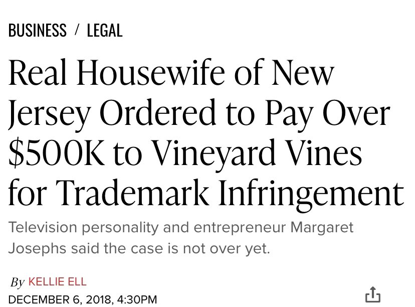 Real Housewives of New Jersey star Margaret Josephs lifestyle brand Macbeth Collection was sued for 12 million by clothing company Vineyard. Competitor Vineyard Vines sued her company Macbeth Collection for trademark infringement. Margaret was the daughter of.
